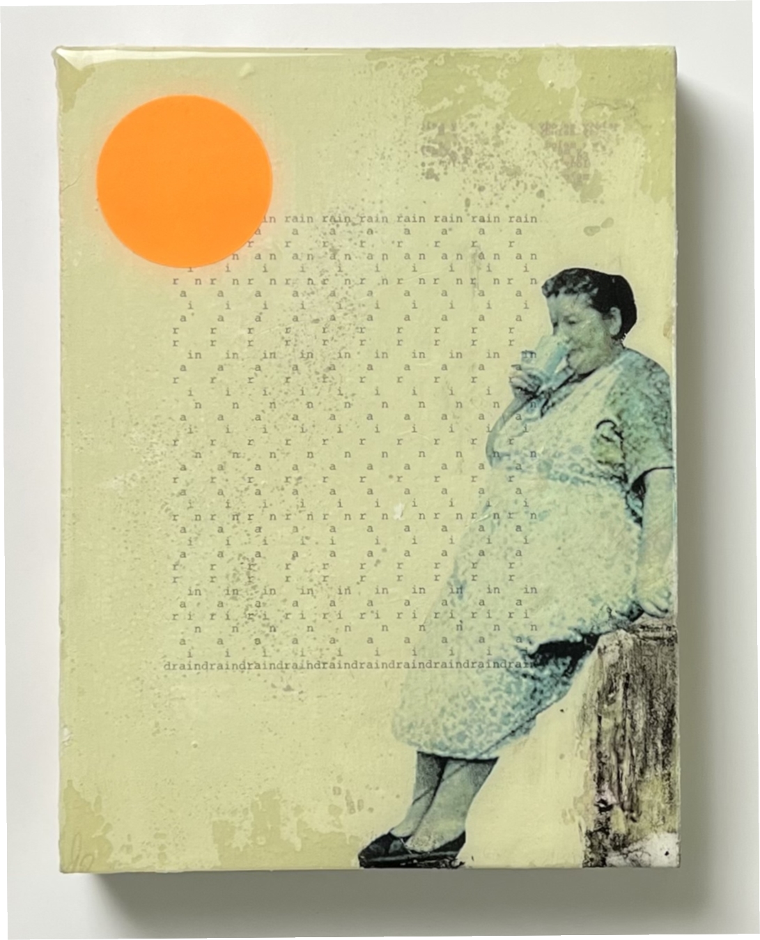 Auch hier steht immer eine Person im Fokus. Jede Serie hat eine Hauptperson, die immer wieder in verschieden gemalte Hintergründe gesetzt wird. Durch den Mix aus Malerei, Collage und Zeichnung entstehen so kleine exklusive Serien von Unikaten.